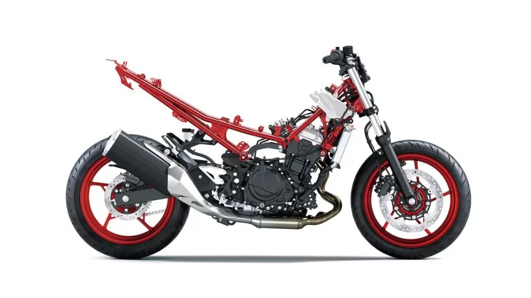 Het stalen trellisframe, geïnspireerd op de Ninja H2, is ontworpen voor optimale stijfheid met een laag gewicht. De motor fungeert als dragend deel van het frame, wat stabiliteit en wendbaarheid ten goede komt. Met een rijklaargewicht van 171 kg en een zithoogte van 785 mm is de Z500 SE eenvoudig te hanteren, zowel in stadsverkeer als bij bochtige trajecten.